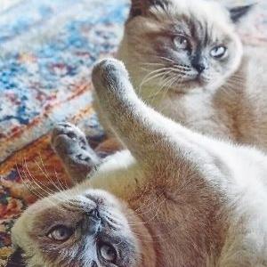 Romy und Leni sind Nicoles souveräne Begleiterinnen im Homeoffice – zwei britische Kurzhaar-Damen mit gelassenem Charme und einer beeindruckenden Präsenz. Mit ihrem weichen, grauen Fell und den hellblauen Augen bringen sie Ruhe, Wärme und eine gute Portion Humor in den Arbeitsalltag.